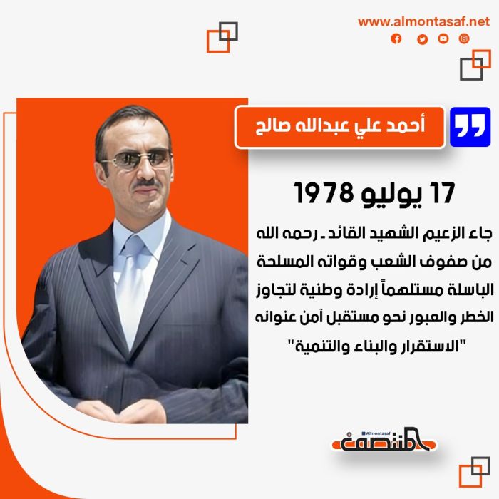 يوم 17 يوليو 1978، جاء الزعيم الشهيد القائد ـ رحمه الله ـ من صفوف الشعب وقواته المسلحة الباسلة مستلهماً إرادة وطنية لتجاوز الخطر والعبور نحو مستقبل آمن عنوانه "الاستقرار والبناء والتنمية" المنتصف نت منذ 6 أشهر مشاركة الخبر: