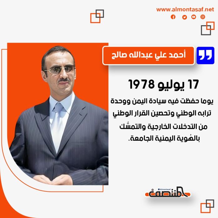 17 يوليو: يوما حفظت فيه سيادة اليمن ووحدة ترابه الوطني وتحصين القرار الوطني من التدخلات الخارجية والتمسُّك بالهُوية اليمنية الجامعة. المنتصف نت منذ 6 أشهر مشاركة الخبر: