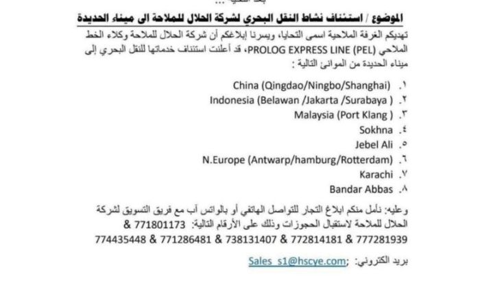 وتظهر الوثيقة الرسمية، الممهورة بتوقيع الغرفة الملاحية، إخطاراً موجهاً إلى الغرفة التجارية الصناعية في أمانة العاصمة، يعلن فيه أن شركة "الحلال للملاحة البحرية" عادت لاستئناف رحلاتها البحرية إلى الحديدة بعد توقف استمر لأشهر، مع تحديد موانئ انطلاق البضائع في إيران وباكستان وماليزيا والهند والصين وإندونيسيا وشمالي أوروبا، ودعوة التجار للتواصل المباشر لحجز شحناتهم.