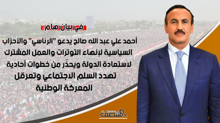في بيان هام : أحمد علي عبد الله صالح يدعو "الرئاسي" والأحزاب السياسية لإنهاء التوترات والعمل المشترك لاستعادة الدولة ويحذّر من خطوات أحادية تهدد السلم الاجتماعي وتعرقل المعركة الوطنية المنتصف نت منذ شهر مشاركة الخبر: