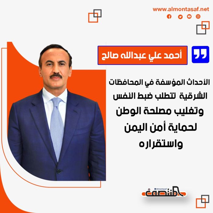 أحمد علي عبد الله صالح : الأحداث المؤسفة في المحافظات الشرقية تتطلب ضبط النفس وتغليب مصلحة الوطن لحماية أمن اليمن واستقراره المنتصف نت منذ شهر مشاركة الخبر: