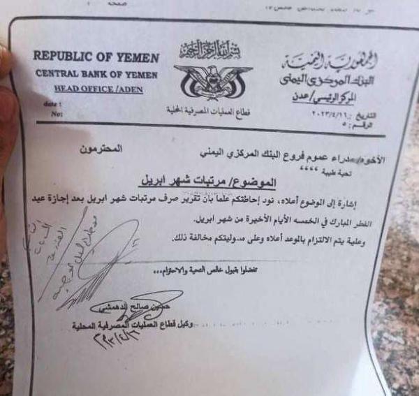 وفي الوقت نفسه صدرت مذكرة رسمية أخرى صادرة عن وكيل قطاع العمليات المصرفية المحلية في البنك المركزي اليمني بعدن، حسين صالح الدهمشي تتضمن التوجيه بتأجيل صرف راتب شهر أبريل الجاري إلى بعد عيد الفطر المبارك.