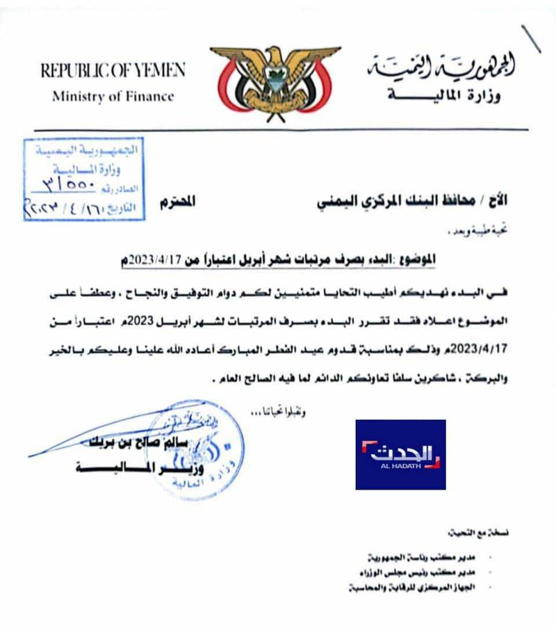 وتداول ناشطون في مواقع التواصل الاجتماعي، مذكرتين رسميتين الأولى صادرة عن وزير المالية سالم بن بريك وتتضمن التوجيه بصرف راتب شهر أبريل لجميع الموظفين في مناطق سيطرة الحكومة ابتداء من اليوم الإثنين ١٧ ابريل الجاري وذلك بمناسبة قدوم عيد الفطر المبارك .